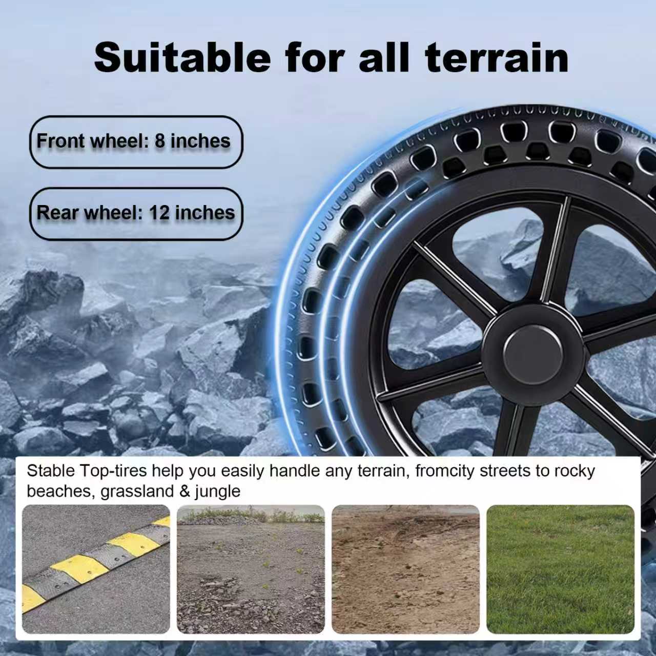 Wheels size: 7" front/ 12" rear puncture-resistant tires