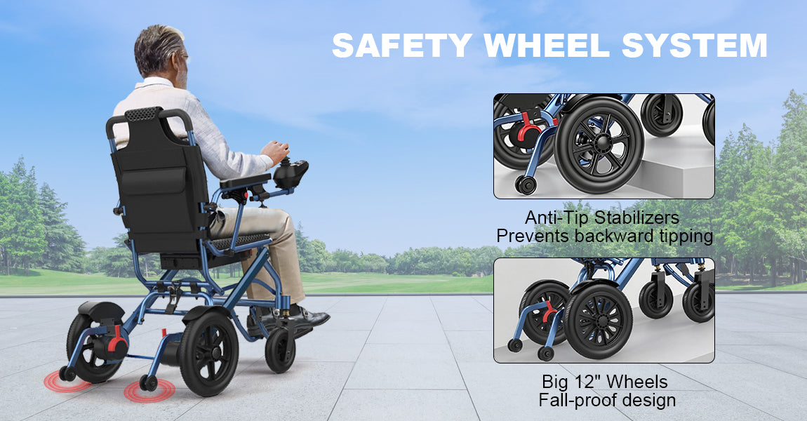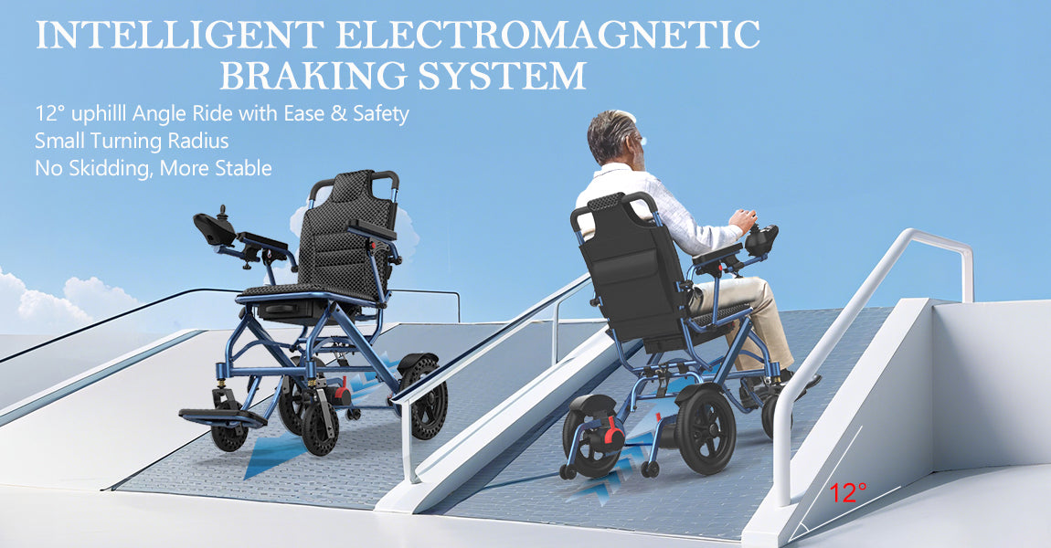 Electromagnetic brakes & anti-tip wheels for safer riding.