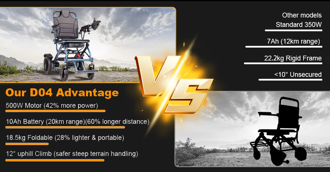 D04 lightweight electric wheelchair features both manual & electric modes. Even when the battery is depleted, can be easily pushed by hand, ensuring uninterrupted mobility and peace of mind.