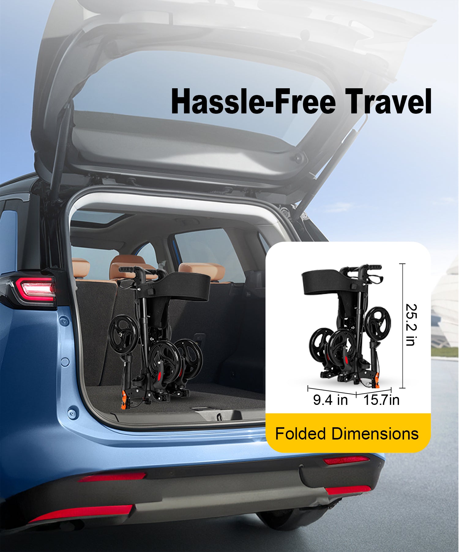 At just 16.76 lbs, the rolling walker can be quickly folded and stored away to save space – perfect for travel, car and plane transport.