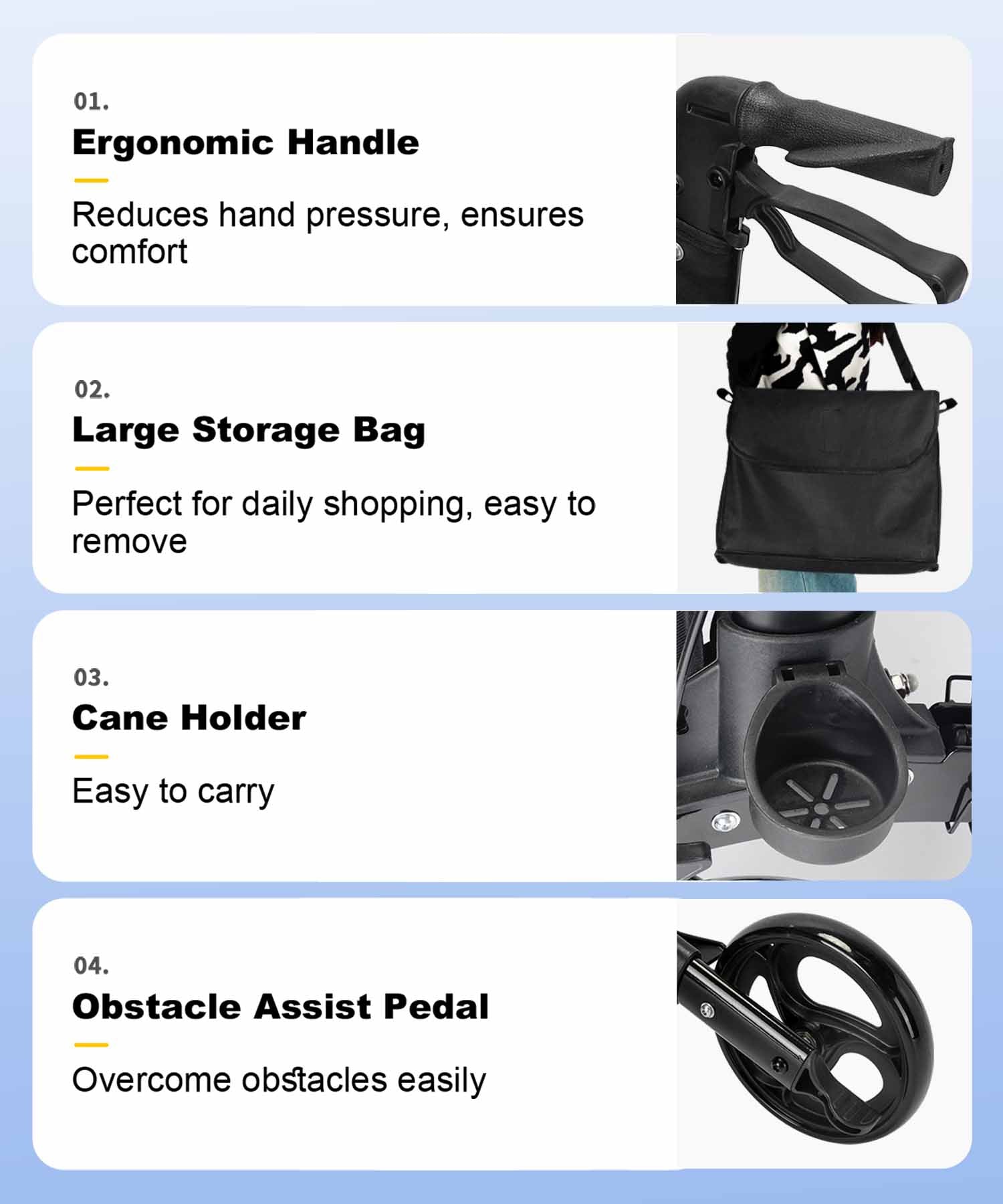 Rollator features ergonomically designed, comfortable handles that reduce hand fatigue, providing effortless support even during extended use.